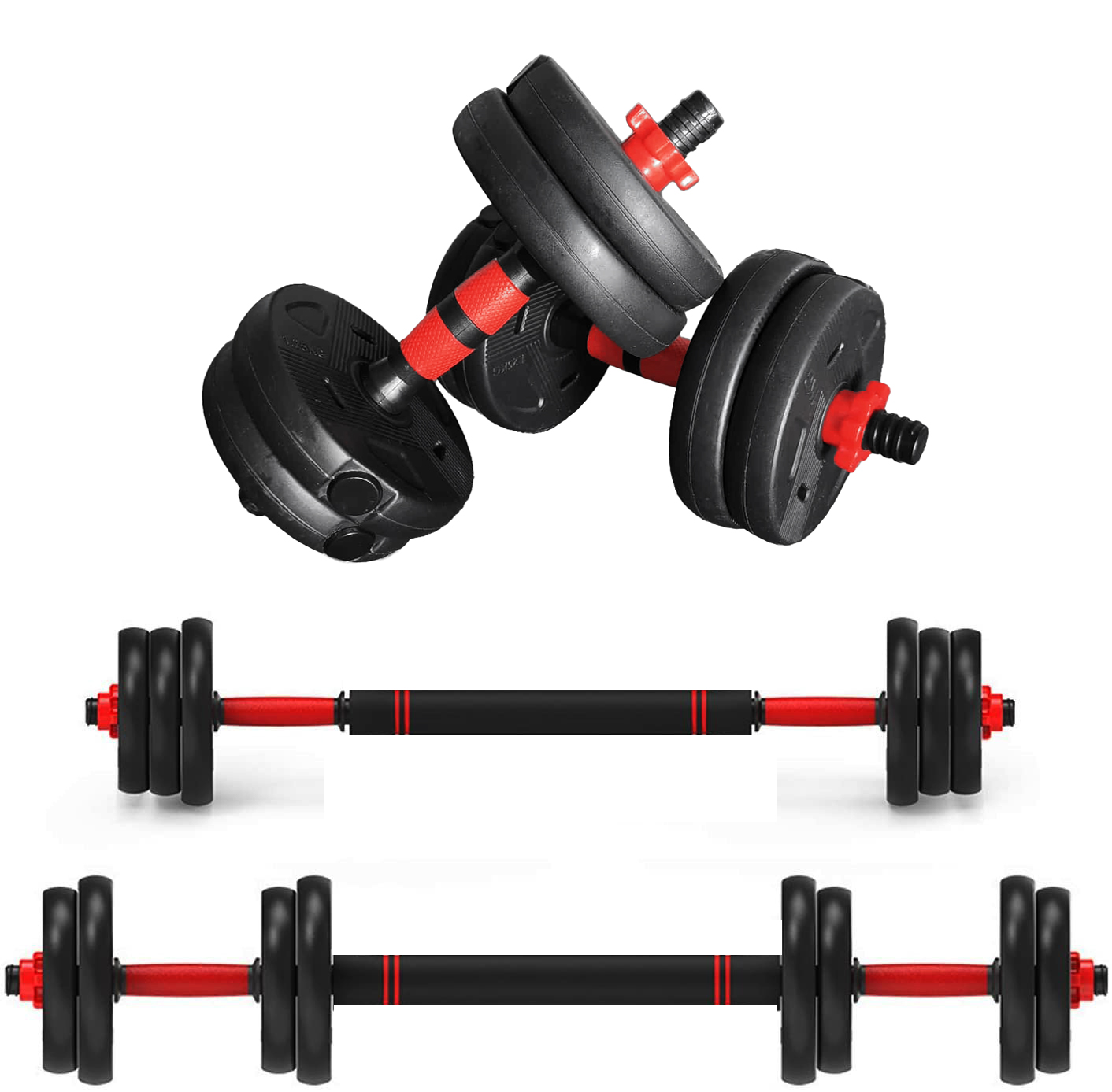 Univerzální nakládací sada zahrnuje dvě jednoruční a jednu obouruční činku. Díky variabilnímu systému ji můžete sestavit několika způsoby – buď jako klasické jednoručky pomocí krátkých os, nebo s využitím spojovací tyče vytvořit delší obouruční činku. Spojovací prvek umožňuje propojení obou kratších os, takže si činku snadno nastavíte a zatížíte podle svých potřeb. Závaží jsou vyrobena z pevného cementového jádra s odolným vinylovým povrchem, který zajišťuje vyšší odolnost proti opotřebení, tlumí nárazy a chrání podlahu před poškozením. Vinylový potah je navíc snadno omyvatelný a příjemný na dotek. Osy jsou vybaveny bezpečnostními maticemi pro pevné uchycení závaží a bezpečné cvičení. Celá sada je vhodným řešením pro domácí trénink i doplnění vybavení menší posilovny.