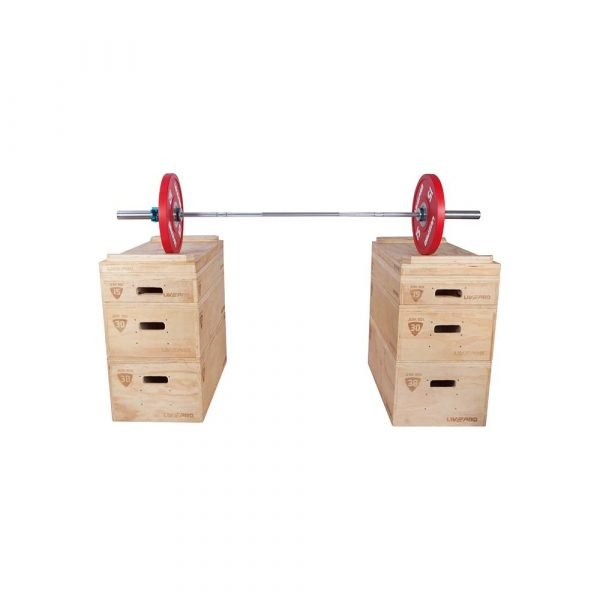Dřevěné bloky LivePro jsou výškově přizpůsobitelné Vašim požadavkům. Výškovou polohu si určíte přidáním či ubráním boxu. Masivní a pevná konstrukce udrží váhu až do 500 kg. Díky jednotlivým blokům si nastavíte výšku v rozmezí 6 až 90 cm do výšky. Každý dřevěný blok je potištěn informací o velikosti. Chybět nesmí ani 2 vyfrézovaná madla pro lehčí manipulaci. Základna přitom zabere pouhých 91,5 x 51 cm. Proti spadnutí osy se závažím jsou zde připevněny zarážky.