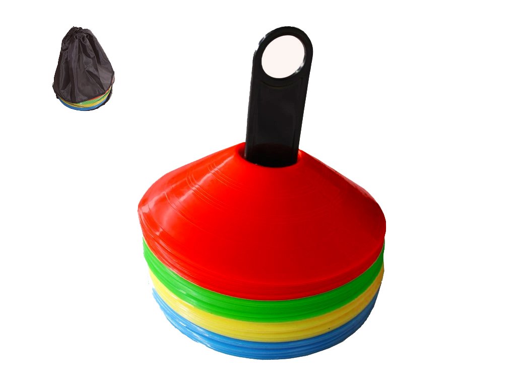 Jsou výrazně barevné kužely vyrobené z PP materiálu. Kvalitna základna o Ø20 cm. Určené pro označení terénu při na klubových trénincích na každém povrchu. Oka na špici modelu jsou určené pro uchycení gymnastických tyčí a vytváření mini překážek. Tato pomůcka je nezbytná pro každý venkovní nebo halový trénink. Součástí je také rozkládatelná základna/stojan pro snadné uschování kuželů/met. Celá sada je dodávána v nylonovém bagu.