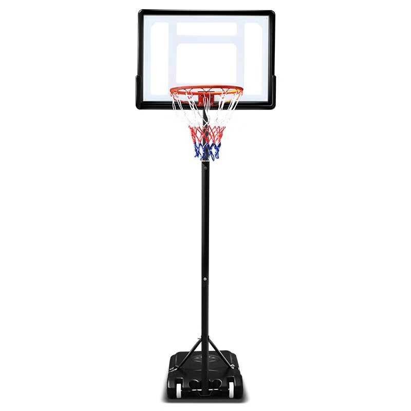 Průhledná deska z odolného PVC s černo-bílým rámem působí čistě a moderně. Obruč má klasické rozměry pro dětské koše a doplňuje ji tříbarevná síťka v odstínech červené, modré a bílé. Pevná černá základna se plní vodou nebo pískem, díky čemuž drží celou konstrukci stabilně i při energičtější hře.