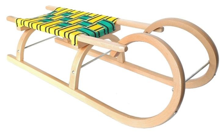 Celodřevěné sáňky se zahnutým obloučkem na ruce. Sedadlo je vyplétané textilními nepromokavými popruhy. Skluznice, vruty a rozpěrka jsou opatřeny protikorodujícím lakem. Sáňky určené pro rekreační využití. Sáně je možné doplnit o dětskou ohrádku. Obrázky jsou ilustrativní, barevné provedení se může lišit. Dodáváno dle dostupnosti na skladu.