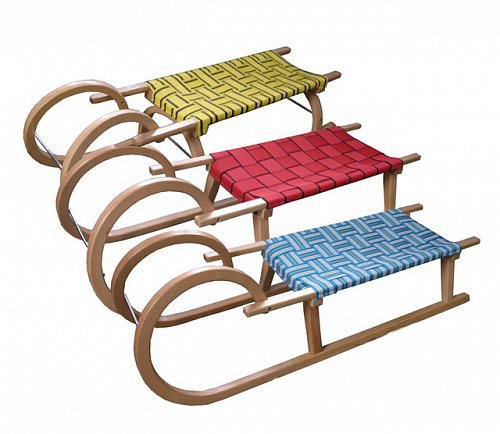 Celodřevěné sáňky se zahnutým obloučkem na ruce. Sedadlo je vyplétané textilními nepromokavými popruhy. Skluznice, vruty a rozpěrka jsou opatřeny protikorodujícím lakem. Sáňky určené pro rekreační využití. Sáně je možné doplnit o dětskou ohrádku. Délka sedáku umožňuje jízdu dvěma sáňkařům najednou. Obrázky jsou ilustrativní, barevné provedení se může lišit.