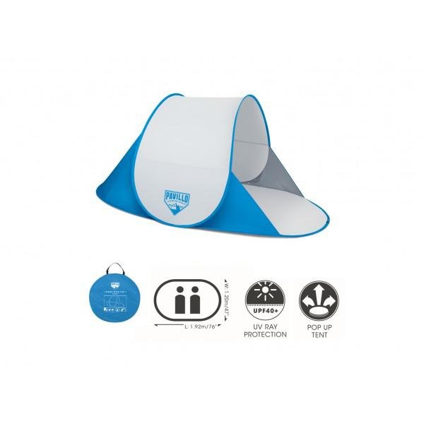 Plážový stan oceníte především tehdy, pokud cestujete k moři s malými dětmi. Stan je zabalen v malém látkovém polyesterovém vaku. Pro své rozměry a váhu je vhodný i pro cestování na dovolenou letadlem. Stan je vyroben z polyesteru, podlaha z polyetilenu. Jeho sestavení i rozložení je velice jednoduché a zvládne ho úplně každý. Svou konstrukcí stan zajišťuje dostatečné množství přístupu čerstvého vzduchu. Je konstruován pro 2 dospělé osoby. Stan stačí vyndat z obalu a položit na zem. Stan se sám rozloží. Stan se skládá kroucením (děláním tzv. osmiček).